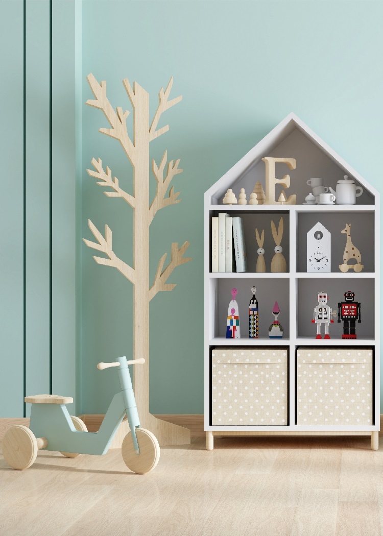 Первое, о чем мы позаботимся, — это безопасность. Никаких острых углов и мелкого декора. Это защитит малыша от травм и позволит с удовольствием познавать окружающий мир. Тем более что новорожденным требуется минимальный набор мебели: кроватка, пеленальный столик и небольшой стеллаж или комод для игрушек.