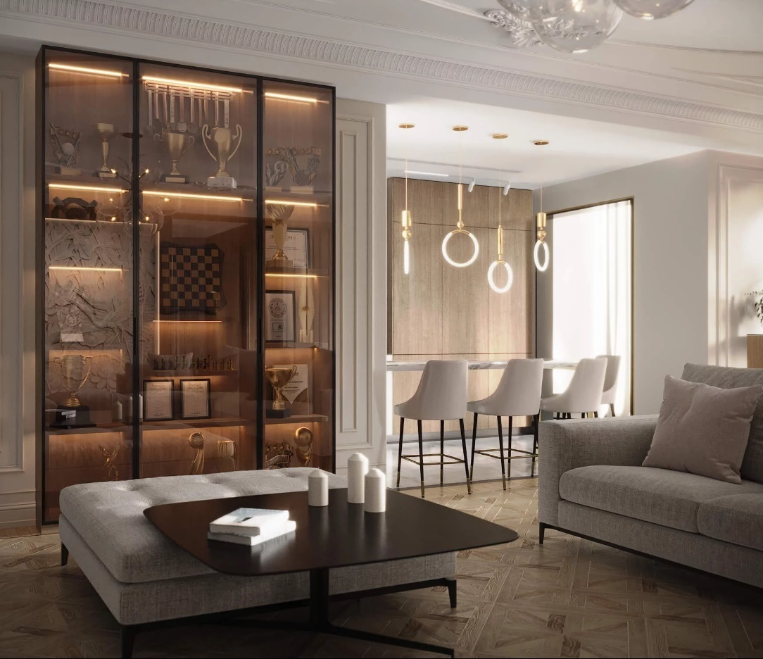 Вариант для тех, у кого объемная пустота ассоциируется скорее с недосказанностью, а обилие декора — с уютом. Современный классический стиль — это квинтэссенция элементов из исторических периодов (барокко, империя, ренессанс). Это микс. Характеризуется изысканностью и богатством. «Инструменты»: натуральная кожа, жаккард, экзотические породы дерева, золотые акценты, гипсовый лепной декор с орнаментальными вставками.